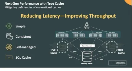 True Cache delivers application-transparent mid-tier caching with transactional consistency guarantees. Unlike external caching layers that require application code to manage cache population and invalidation, True Cache automatically maintains consistency with the database.