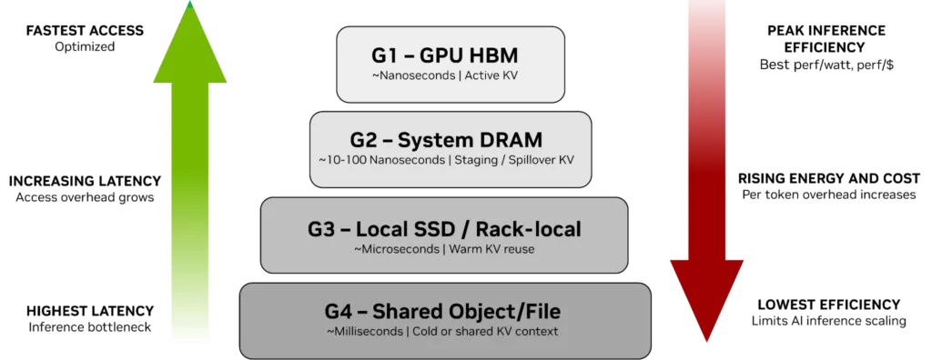NVIDIA ICMS lives within a four-tier memory and storage hierarchy governing KV cache placement in transformer-based inference systems. The hierarchy is built around the fundamental tradeoffs between access latency, capacity, and power efficiency that become critical as context windows extend into millions of tokens and models scale toward trillions of parameters.